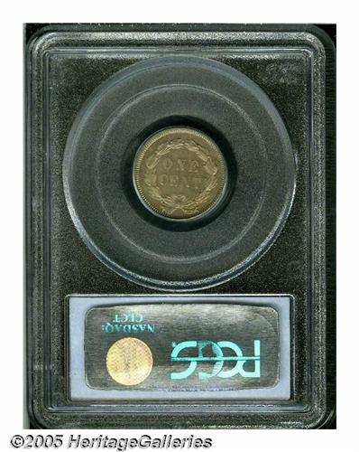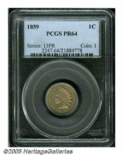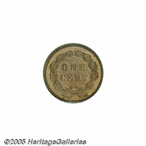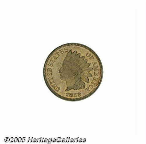 <B>1859<1C> PR64 PCGS.</B></I> A subtly reflective golden-tan specimen with a few carbon specks congregated in front of the portrait. These, combined with the somewhat muted appearance, cause this important one-year type to fall short of Gem status.