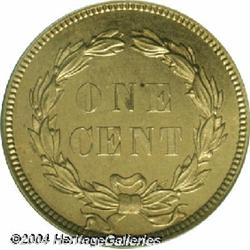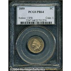 <B>1859<1C> PR64 PCGS.</B></I> A needle-sharp near-Gem dominated by honey-gold color. A few carbon speckles are seen on the obverse, one spot in particular is mentioned on the N of ONE on the opposite side. Although business strikes of this popular single year type are readily available, proofs are scarcer and always in demand. <BR><BR><B>Important notice:</B> Heritage usually auctions material at the rate of 200-250 lots per hour. On some occasions eBay Live bid software or the Internet may not be able to keep up with the pace of the auction. We recommend placing a realistic absentee bid now as insurance to avoid disappointment. Occasionally the auctioneer may eliminate or reject an eBay Live bid, and the auctioneer may also reopen a lot after the close of the eBay live bidding (usually because we missed an audience bid), and may reject your bid even if it shows you as the winning bidder. By bidding via eBay Live, you agree that Heritage may award the lot to another bidder at its sole discretion under the circumstances described above or any other reasonable circumstances. Since eBay bids are not shown to us until we open the lot on the floor, we treat those bids just like floor bids. In most cases the floor responds before the eBay bid is presented to us, due to Internet lag time, so for consistency we have made it a policy that floor bids are always considered first over tie eBay live bids. Also please note that all Heritage lots purchased through eBay Live carry a 20% Buyer's Premium. Please make sure you read the Terms and Conditions before you bid.