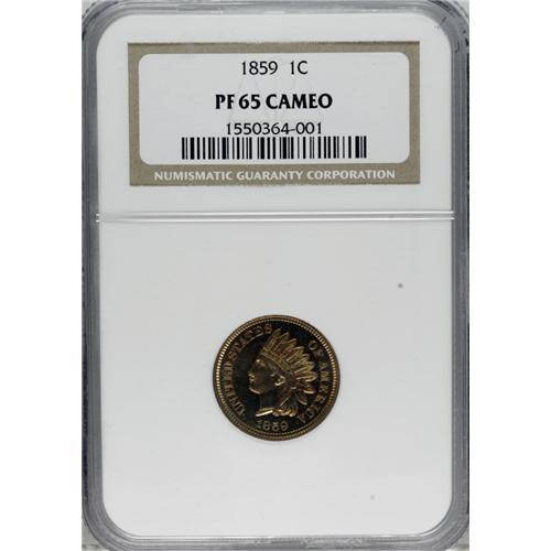 <B>1859 1C PR65 Cameo NGC.</B></I> As a one-year-only proof variety, the 1859 cent faces added demand from type collectors. Few of the estimated 800 examples produced could match the eye appeal of this Gem. The lemon-gold obverse fields have a trace of orange, while the reverse has pale copper coloration. Boldly struck and well-preserved with undeniable contrast. Census: 5 in 65 Cameo, 4 finer (3/07).<BR><BR><b>Shipping:</b> Coins & Currency (<a target="_blank" href="http://www.heritageauctions.com/common/shipping.php">view shipping information</a>)