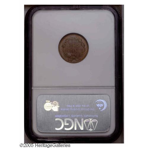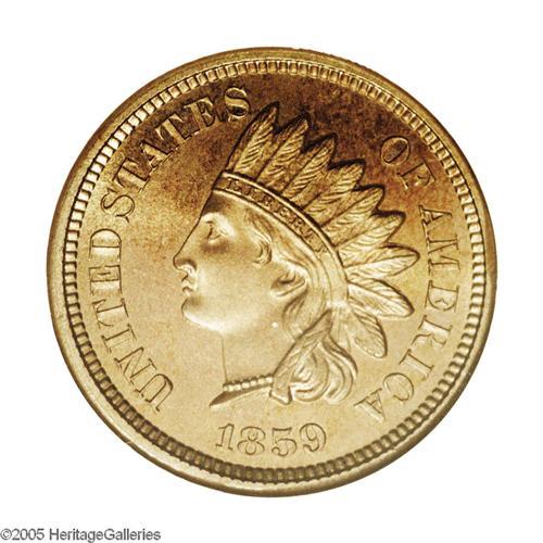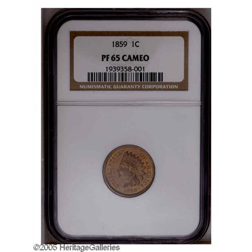 <B>1859<1C> PR65 Cameo NGC.</B></I> Orange-gold and lavender colors blend throughout this intricately struck and nicely mirrored Gem. Aside from 1858 patterns, the shield-less Indian Cent type was only struck in 1859. Business strikes were plentiful, and were saved in quantity as a novel type, but only 800 proofs were struck, many of which have not survived the passage of time. Census: 4 in 65 Prooflike, 4 finer (10/05).