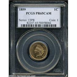 <table><tr><td><TABLE cellSpacing=0 cellPadding=0 width="100%" bgColor=#000000 border=0><TBODY> <TR><TD width="100%"><TABLE cellSpacing=1 cellPadding=3 width="100%" border=0><TBODY><TR><TD width="100%" bgColor=#79735c><FONT face=arial color=#ffffff size=3><B>Description</B> </FONT></TD></TR><TR><TD width="100%" bgColor=#ffffff><FONT face=arial size=2><B>1859 1C PR65 Cameo PCGS.</B></I> An important coin for proof type purposes, this Gem is also rare as one of only three proof Cameo 1859 Indian cents currently certified above PR64 at PCGS. All features display razor-sharp definition over the devices, these features being set atop deep mirrors in the fields. Delicate orange-tan shadings adorn surfaces that have a light coating or cloudy patina on each side. Beautifully preserved, with a single wispy handling mark in the left reverse field, near the rim, as the only apparent surface flaw. Coveted as a one-year type, and this specimen surely ranks among the finest known. Population: 2 in 65 Cameo, 1 finer (9/03). </FONT></TD></TR></TBODY></TABLE></TD></TR></TBODY></TABLE><BR><A name=PricesRealized></A><TABLE cellSpacing=0 cellPadding=0 width="100%" bgColor=#000000 border=0><TBODY><TR><TD width="100%"><TABLE cellSpacing=1 cellPadding=3 width="100%" border=0><TBODY><TR><TD width="100%" bgColor=#79735c><A name=PR><FONT face=arial color=#ffffff size=3><B>Previous Prices from Heritage Auctions</B> </FONT></A></TD></TR><TR><TD bgColor=#f6f6ed>No Prior Data Recorded </TD></TR><TR><TD bgColor=#ffffff><FONT face=arial size=1 ?>PLEASE NOTE: All prices realized reflect the final hammer price PLUS the buyer's premium in auctions that charge a buyer's premium. Each item has a notation at the top of the listing indicating whether that lot included a buyer's premium. Example: A item that sells with a final hammer price of $100 and a 20% buyer's premium will display with a price realized of $120. All information listed is intended to be as accurate as possible, but errors are possible. Please use this guide carefully and inform us of any inaccuracies. </FONT></TD></TR></TBODY></TABLE></TD></TR></TBODY></TABLE><BR><TABLE cellSpacing=0 cellPadding=0 width="100%" bgColor=#000000 border=0><TBODY><TR><TD width="100%"><TABLE cellSpacing=1 cellPadding=3 width="100%" border=0><TBODY><TR><TD width="100%" bgColor=#79735c colSpan=6><FONT face=arial color=#ffffff size=3><B>Price Guide*</B> </FONT></TD></TR><TR bgColor=#f6f6ed><TD align=middle><B>Grade</B> </TD><TD align=middle><B>Coin World<BR>(Trends)</B> </TD><TD align=middle><B>Numismedia<BR>Retail</B> </TD><TD align=middle><B>Numismedia<BR>Wholesale</B> </TD><TD align=middle><B>Coin<BR>Universe</B> </TD><TD align=middle><B>Heritage<BR>Value Index</B> </TD></TR><TR bgColor=#ffffff><TD align=middle>64</TD><TD align=right>---</TD><TD align=right>---</TD><TD align=right>---</TD><TD align=right>---</TD><TD align=right>$2,277.50</TD></TR><TR style="FONT-WEIGHT: bold" bgColor=#cccfdd><TD align=middle>65</TD><TD align=right>---</TD><TD align=right>---</TD><TD align=right>---</TD><TD align=right>---</TD><TD align=right>$3,330.00</TD></TR><TR bgColor=#ffffff><TD align=middle>66</TD><TD align=right>---</TD><TD align=right>---</TD><TD align=right>---</TD><TD align=right>---</TD><TD align=right>---</TD></TR><TR bgColor=#ffffff><TD colSpan=6><FONT size=1>*All information listed is intended to be as accurate as possible, but errors are possible. No item may be returned or refused based on this information which is provided as a service to our customers. You should contact each pricing source directly to determine the accuracy of this information. </FONT></TD></TR></TBODY></TABLE></TD></TR></TBODY></TABLE><BR><TABLE cellSpacing=0 cellPadding=0 width="100%" bgColor=#000000 border=0><TBODY><TR><TD width="100%"><TABLE cellSpacing=1 cellPadding=3 width="100%" border=0><TBODY><TR><TD width="100%" bgColor=#79735c><FONT face=arial color=#ffffff size=3><B>Population Guide</B> </FONT></TD></TR><TR bgColor=#ffffff><TD align=middle><!-- Begin Output of Population Grid--><TABLE cellSpacing=0 cellPadding=0 width="100%" border=0><TBODY><TR><TD vAlign=center><TABLE cellSpacing=0 width="100%" border=1 cellsadding="3"><TBODY><TR><TD vAlign=center><TABLE cellSpacing=0 cellPadding=3 width="100%" border=1><TBODY><TR><TD vAlign=center align=middle bgColor=#f0f1e8 colSpan=2 <CENTER><FONT face=Arial size=2><B>PCGS Pop </B></FONT><CENTER></CENTER></TD><TD vAlign=center align=middle bgColor=#f0f1e8 colSpan=2><CENTER><FONT face=Arial size=2><B>NGC Pop</B></CENTER></FONT></TD></TR><TR><TD vAlign=center><FONT face=Arial size=2>(65)</FONT> </TD><TD vAlign=center align=right><FONT face=Arial size=2>2</FONT> </TD><TD vAlign=center><FONT face=Arial size=2>(65)</FONT> </TD><TD vAlign=center align=right><FONT face=Arial size=2>0</FONT> </TD></TR><TR><TD vAlign=center><FONT face=Arial size=2>(>65)</FONT> </TD><TD vAlign=center align=right><FONT face=Arial size=2>1</FONT> </TD><TD vAlign=center><FONT face=Arial size=2>(>65)</FONT> </TD><TD vAlign=center align=right><FONT face=Arial size=2>0</FONT> </TD></TR></TBODY></TABLE></TD></TR></TBODY></TABLE></TD></TR></TBODY></TABLE><!-- End Output of Population Grid--></TD></TR></TBODY></TABLE></TD></TR></TBODY></TABLE><BR><TABLE cellSpacing=0 cellPadding=0 width="100%" bgColor=#000000 border=0><TBODY><TR> Important notice: Heritage usually auctions material at the rate of 200-250 lots per hour. On some occasions eBay Live bid software or the Internet may not be able to keep up with the pace of the auction. We recommend placing a realistic absentee bid now as insurance to avoid disappointment. Occasionally the auctioneer may eliminate or reject an eBay Live bid, and the auctioneer may also reopen a lot after the close of the eBay live bidding (usually because we missed an audience bid), and may reject your bid even if it shows you as the winning bidder. By bidding via eBay Live, you agree that Heritage may award the lot to another bidder at its sole discretion under the cir