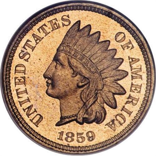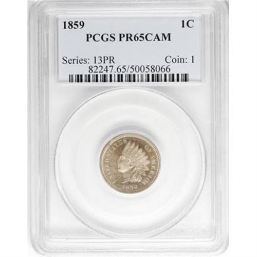 <B>1859 1C PR65 Cameo PCGS.</B></I> An important coin for type purposes, this Gem is also rare as one of only 11 proof Cameo 1859 Indian cents certified above PR64 at PCGS (1/08). The devices all show razor-sharp definition, set atop deep mirrors in the fields. Delicate orange-tan shadings adorn surfaces that have a light, cloudy patina on each side. Beautifully preserved, with a single wispy handling mark in the left reverse field near the rim the only apparent surface flaw. Coveted as a one-year type, this specimen ranks high among the finest known of the issue.<BR><BR><b>Shipping:</b> Coins & Currency (<a target="_blank" href="http://www.heritageauctions.com/common/shipping.php">view shipping information</a>)