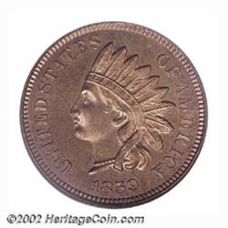 1859 1C PR65 PCGS. A second offering of this rare and worthwhile proof type coin. Fully struck, as one would expect for a proof, the fields are deeply mirrored but the effect is somewhat subdued, especially on the reverse, because of the rich overlay of golden-rose and lilac-gray toning. A distinctive small spot of rust-red color is seen just to the right of the date. Population: 44 in 65, 19 finer (9/02). Important notice: We expect to be auctioning lots at the rate of 200-250 per hour. Sometimes eBay Premier live bid software cannot keep up with that pace, so we strongly recommend that you place a realistic proxy bid now as insurance to avoid disappointment. Also please note that all Heritage/CAA lots purchased through eBay Premier carry a 20% Buyer's Premium. Please make sure you read the Terms and Conditions.