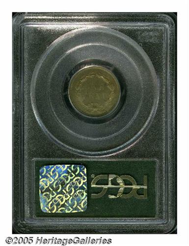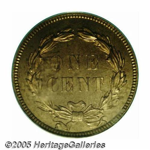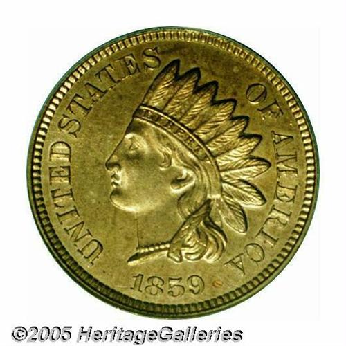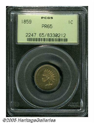 <B>1859<1C> PR65 PCGS.</B></I> A subtly reflective specimen with pinpoint sharpness on the highpoints, being covered on each side in a thin veil of milky lilac patina. There is a solitary spot between the 9 in the date and the final A in AMERICA visible under close scrutiny. Important as a one-year proof type coin. Population: 41 in 65, 21 finer (3/05).