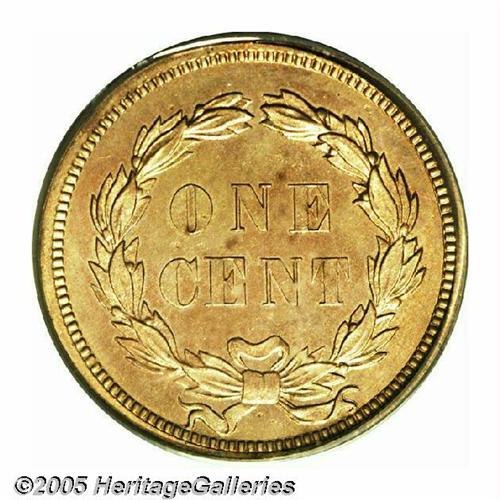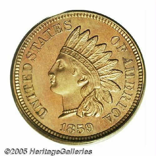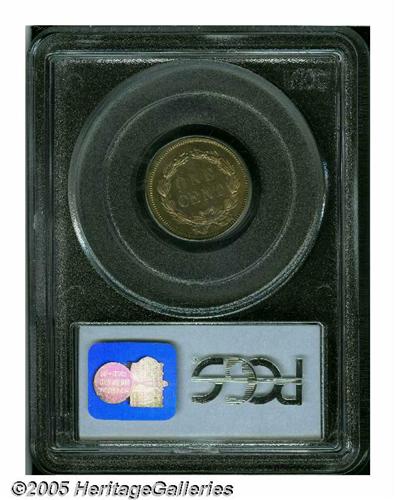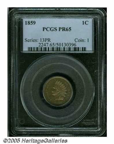 <B>1859<1C> PR65 PCGS.</B></I> This 1859 Proof cent displays a cameo-like effect when the piece is tilted beneath a light source. The surfaces are bathed in a mixture of pastel gold-tan, crimson, lavender, and sky-blue, and display sharply struck design elements. All four diamonds are bold, and the feather tips are relatively strong. There are no significant abrasions, and a few tiny flecks over each side do not distract. Population: 41 in 65, 21 finer (6/05).<BR><I>From The Melrose Bay Collection.</B></I>
