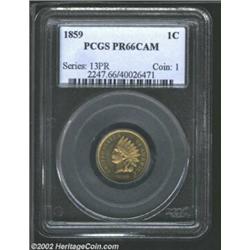 1859 1C PR66 Cameo PCGS. Splendid lemon-gold and rose-violet colors appear when the Cent is rotated under a light. A razor-sharp Gem that shows every detail within the headdress feathers, while the borders of the diamonds have sharp definition. Beautifully preserved, and infrequently encountered with cameo contrast. The contrast on the reverse is especially strong. This is the only Cameo example currently certified above PR64 by PCGS. Coveted as a one-year type, and this example surely ranks among the finest known. Important notice: We expect to be auctioning lots at the rate of 200-250 per hour. Sometimes eBay Premier live bid software cannot keep up with that pace, so we strongly recommend that you place a realistic proxy bid now as insurance to avoid disappointment. Also please note that all Heritage/CAA lots purchased through eBay Premier carry a 20% Buyer's Premium. Please make sure you read the Terms and Conditions.