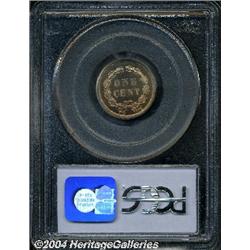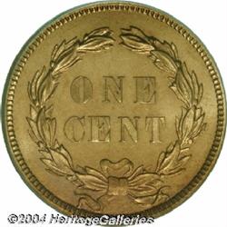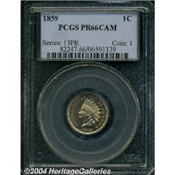 <B>1859<1C> PR66 Cameo PCGS.</B></I> First year of issue for the Indian cent, the figure of "Liberty" is actually represented by a Caucasian female that is wearing a headdress of the Chippewa tribe. Only struck with this obverse and reverse combination in 1859, some 800 proofs were minted minus an unknown number that were melted at year's end. This is a bright, lightly toned example that appears to be a fully original example. Each side is lightly coated with pleasant lilac-red patina, and for pedigree purposes, a lintmark is seen through the N of UNITED into the left obverse field. The fields are deeply reflective and there is a significant amount of mint frost over the devices which gives the coin an appealing cameo contrast. Population: 3 in 66 Cameo, none finer (9/04). <BR><BR><B>Important notice:</B> Heritage usually auctions material at the rate of 200-250 lots per hour. On some occasions eBay Live bid software or the Internet may not be able to keep up with the pace of the auction. We recommend placing a realistic absentee bid now as insurance to avoid disappointment. Occasionally the auctioneer may eliminate or reject an eBay Live bid, and the auctioneer may also reopen a lot after the close of the eBay live bidding (usually because we missed an audience bid), and may reject your bid even if it shows you as the winning bidder. By bidding via eBay Live, you agree that Heritage may award the lot to another bidder at its sole discretion under the circumstances described above or any other reasonable circumstances. Since eBay bids are not shown to us until we open the lot on the floor, we treat those bids just like floor bids. In most cases the floor responds before the eBay bid is presented to us, due to Internet lag time, so for consistency we have made it a policy that floor bids are always considered first over tie eBay live bids. Also please note that all Heritage lots purchased through eBay Live carry a 20% Buyer's Premium. Please make sure you read the Terms and Conditions before you bid.