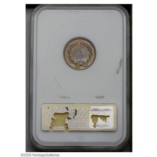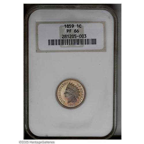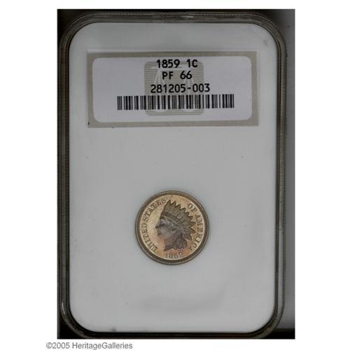 <B>1859<1C> PR66 NGC.</B></I> Broad borders, razor sharp striking detail, and glowing reflectivity in the fields readily identify this coin as a proof. There is also a reverse die chip (as produced) between the denticles just before 12 o'clock that is diagnostic of the reverse die used for the proof 1859 Indian Cent. The otherwise honey-tan color yields to pastel tinged champagne, apricot, and lilac shadings as the surfaces dip into the light. Striations (also as struck) are seen at the same angles, but there are expectantly few blemishes for the premium quality Gem grade. Although federal records report that 800 proofs were made in this, the first year of the Indian Cent series, many examples were melted as unsold at year's end. A rare date, survivors are always in demand for first-year proof type purposes.<BR><I>From the Joseph P. Gorrell Collection.</B></I>