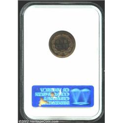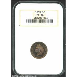 1859 1C PR66 NGC. Broad borders, razor sharp striking detail, and glowing reflectivity in the fields readily identify this coin as a proof. There is also a reverse die chip (as produced) between the denticles just before 12 o'clock that is diagnostic of the reverse die used for the proof 1859 Indian Cent. The otherwise honey-tan color yields to pastel tinged champagne, apricot, and lilac shadings as the surfaces dip into the light. Striations (also as struck) are seen at the same angles, but there are expectantly few blemishes for the premium quality Gem grade. Although federal records report that 800 proofs were made in this, the first year of the Indian Cent series, many examples were melted as unsold at year's end. A rare date, survivors are always in demand for first-year proof type purposes.From the Joseph P. Gorrell Collection. Important notice: We expect to be auctioning lots at the rate of 200-250 per hour. Sometimes eBay Premier live bid software cannot keep up with that pace, so we strongly recommend that you place a realistic proxy bid now as insurance to avoid disappointment. Also please note that all Heritage/CAA lots purchased through eBay Premier carry a 20% Buyer's Premium. Please make sure you read the Terms and Conditions.