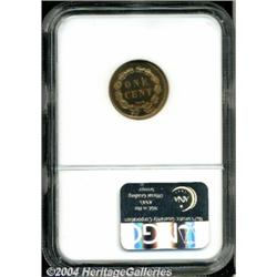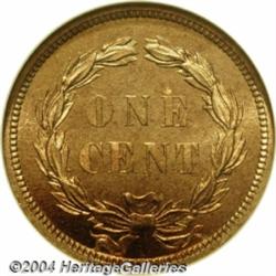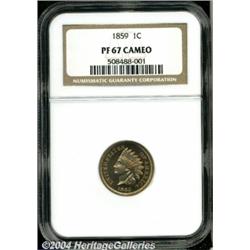 <B>1859<1C> PR67 Cameo NGC.</B></I> Designed by James B. Longacre, the Indian Cent made its debut in 1859. This initial issue displayed a simple reverse design with the denomination ONE CENT enclosed in a laurel wreath. Since Longacre's oak wreath and shield motif was adopted in 1860, the 1859 has become doubly important as a one-year type. In the late 1850s, proof sets were not as popular among collectors as they are today, and a sizeable percentage of the 800 specimens reportedly struck was undoubtedly melted as unsold. This nearly flawless, razor sharp representative exhibits a rich copper-golden color overall, and is totally void of carbon and is otherwise essentially as made nearly a century and a half ago. Currently (7/04) this is the single finest known Cameo proof example to either PCGS or NGC, one non-cameo Proof 67 is known at PCGS. <BR><BR><B>Important notice:</B> Heritage usually auctions material at the rate of 200-250 lots per hour. On some occasions eBay Live bid software or the Internet may not be able to keep up with the pace of the auction. We recommend placing a realistic absentee bid now as insurance to avoid disappointment. Occasionally the auctioneer may eliminate or reject an eBay Live bid, and the auctioneer may also reopen a lot after the close of the eBay live bidding (usually because we missed an audience bid), and may reject your bid even if it shows you as the winning bidder. By bidding via eBay Live, you agree that Heritage may award the lot to another bidder at its sole discretion under the circumstances described above or any other reasonable circumstances. Since eBay bids are not shown to us until we open the lot on the floor, we treat those bids just like floor bids. In most cases the floor responds before the eBay bid is presented to us, due to Internet lag time, so for consistency we have made it a policy that floor bids are always considered first over tie eBay live bids. Also please note that all Heritage lots purchased through eBay Live carry a 20% Buyer's Premium. Please make sure you read the Terms and Conditions before you bid. </span></font></tr></table></td></tr></table>