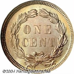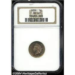 <B>1859<1C> PR67 NGC.</B></I> After several pattern strikings in the previous year, the small cent was redesigned in 1859 with the image of a Native American with Caucasian features (!) wearing the headdress of the Chippewa tribe. On the reverse, the wreath is actually composed of olive leaves, although it is commonly thought to be made of laurel. While readily available in PR64-65 grades, the 1859 is a notable condition rarity in Superb condition with only one other piece so graded by NGC and none finer at either service (9/04). This is one of the most visually appealing Indian cents we have ever seen of any date. Each side displays pale lilac patina that is accented by reddish-coppery tones around the margins and scattered streaks of rose and blue. A one-year type coin of unparalleled beauty. <BR><BR><B>Important notice:</B> Heritage usually auctions material at the rate of 200-250 lots per hour. On some occasions eBay Live bid software or the Internet may not be able to keep up with the pace of the auction. We recommend placing a realistic absentee bid now as insurance to avoid disappointment. Occasionally the auctioneer may eliminate or reject an eBay Live bid, and the auctioneer may also reopen a lot after the close of the eBay live bidding (usually because we missed an audience bid), and may reject your bid even if it shows you as the winning bidder. By bidding via eBay Live, you agree that Heritage may award the lot to another bidder at its sole discretion under the circumstances described above or any other reasonable circumstances. Since eBay bids are not shown to us until we open the lot on the floor, we treat those bids just like floor bids. In most cases the floor responds before the eBay bid is presented to us, due to Internet lag time, so for consistency we have made it a policy that floor bids are always considered first over tie eBay live bids. Also please note that all Heritage lots purchased through eBay Live carry a 20% Buyer's Premium. Please make sure you read the Terms and Conditions before you bid.