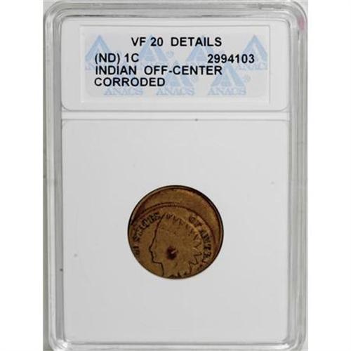 <B>No Date 1C Indian Cent--Corroded, Off Center--ANACS. VF20 Details.</B></I> <BR><BR><B>Coin Engraver:</B> James B. Longacre<BR><BR><b>Shipping:</b> Coins & Currency (<a target="_blank" href="http://www.heritageauctions.com/common/shipping.php">view shipping information</a>)
