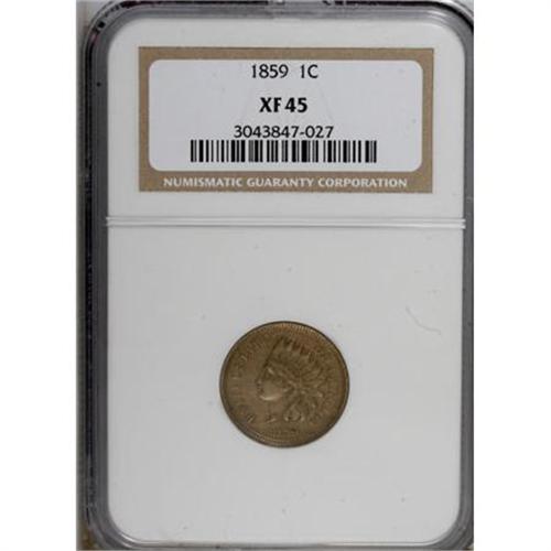 <B>1859 1C XF45 NGC.</B></I> NGC Census: (33/1160). PCGS Population (45/1447). Mintage: 36,400,000. Numismedia Wsl. Price for NGC/PCGS coin in XF45: $97. (#2052)<BR><BR><B>Coin Engraver:</B> James B. Longacre<BR><BR><b>Shipping:</b> Coins & Currency (<a target="_blank" href="http://www.heritageauctions.com/common/shipping.php">view shipping information</a>)