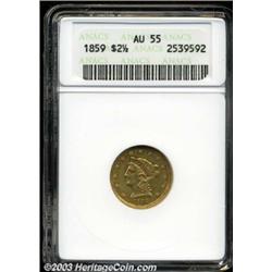 <TABLE cellSpacing=0 cellPadding=0 width="100%" bgColor=#000000 border=0><TBODY><TR><TD width="100%"><TABLE cellSpacing=1 cellPadding=3 width="100%" border=0><TBODY><TR><TD width="100%" bgColor=#79735c><FONT face=arial color=#ffffff size=3><B>Description</B> </FONT></TD></TR><TR><TD width="100%" bgColor=#ffffff><FONT face=arial size=2><B>1859 $2 1/2 New Reverse AU55 ANACS.</B></I> A well struck piece with glimpses of rose-gold luster. A short pinscratch follows the sixth star, but an original and attractive coin. The mintage of less than 40,000 pieces is shared with the scarcer Old Reverse variety.<BR><I>From The Dr. Douglas Roane Collection.</B></I> </FONT></TD></TR></TBODY></TABLE></TD></TR></TBODY></TABLE><BR><A name=PricesRealized></A><TABLE cellSpacing=0 cellPadding=0 width="100%" bgColor=#000000 border=0><TBODY><TR><TD width="100%"><TABLE cellSpacing=1 cellPadding=3 width="100%" border=0><TBODY><TR><TD width="100%" bgColor=#79735c><A name=PR><FONT face=arial color=#ffffff size=3><B>Previous Prices from Heritage Auctions</B> </FONT></A></TD></TR><TR><TD bgColor=#f6f6ed><TABLE cellSpacing=0 cellPadding=0 width="100%" border=1><TBODY><TR><TD align=middle width="33%"><B>Date</B></TD><TD align=middle width="33%"><B>Service</B></TD><TD align=middle width="33%"><B>Price</B></TD></TR><TR bgColor=whitesmoke><TD width="33%"><B>06/08/2002</B></TD><TD width="33%">ANACS</TD><TD width="33%">$316.25</TD></TR></TBODY></TABLE></TD></TR><TR><TD bgColor=#ffffff><FONT face=arial size=1 ?>PLEASE NOTE: All prices realized reflect the final hammer price PLUS the buyer's premium in auctions that charge a buyer's premium. Each item has a notation at the top of the listing indicating whether that lot included a buyer's premium. Example: A item that sells with a final hammer price of $100 and a 20% buyer's premium will display with a price realized of $120. All information listed is intended to be as accurate as possible, but errors are possible. Please use this guide carefully and inform us of any inaccuracies. </FONT></TD></TR></TBODY></TABLE></TD></TR></TBODY></TABLE><BR><TABLE cellSpacing=0 cellPadding=0 width="100%" bgColor=#000000 border=0><TBODY><TR><TD width="100%"><TABLE cellSpacing=1 cellPadding=3 width="100%" border=0><TBODY><TR><TD width="100%" bgColor=#79735c colSpan=6><FONT face=arial color=#ffffff size=3><B>Price Guide*</B> </FONT></TD></TR><TR bgColor=#f6f6ed><TD align=middle><B>Grade</B> </TD><TD align=middle><B>Coin World<BR>(Trends)</B> </TD><TD align=middle><B>Numismedia<BR>Retail</B> </TD><TD align=middle><B>Numismedia<BR>Wholesale</B> </TD><TD align=middle><B>Coin<BR>Universe</B> </TD><TD align=middle><B>Heritage<BR>Value Index</B> </TD></TR><TR bgColor=#ffffff><TD align=middle>53</TD><TD align=right>---</TD><TD align=right>$563.00</TD><TD align=right>$450.00</TD><TD align=right>---</TD><TD align=right>$391.08</TD></TR><TR style="FONT-WEIGHT: bold" bgColor=#cccfdd><TD align=middle>55</TD><TD align=right>$625.00</TD><TD align=right>$630.00</TD><TD align=right>$500.00</TD><TD align=right>$455.00</TD><TD align=right>$448.50</TD></TR><TR bgColor=#ffffff><TD align=middle>58</TD><TD align=right>$800.00</TD><TD align=right>$690.00</TD><TD align=right>$550.00</TD><TD align=right>---</TD><TD align=right>$797.68</TD></TR><TR bgColor=#ffffff><TD colSpan=6><FONT size=1>*All information listed is intended to be as accurate as possible, but errors are possible. No item may be returned or refused based on this information which is provided as a service to our customers. You should contact each pricing source directly to determine the accuracy of this information. </FONT></TD></TR></TBODY></TABLE></TD></TR></TBODY></TABLE><BR><TABLE cellSpacing=0 cellPadding=0 width="100%" bgColor=#000000 border=0><TBODY><TR><TD width="100%"><TABLE cellSpacing=1 cellPadding=3 width="100%" border=0><TBODY><TR><TD width="100%" bgColor=#79735c><FONT face=arial color=#ffffff size=3><B>Population Guide</B> </FONT></TD></TR><TR bgColor=#ffffff><TD align=middle><!-- Begin Output of Population Grid--><TABLE cellSpacing=0 cellPadding=0 width="100%" border=0><TBODY><TR><TD vAlign=center><TABLE cellSpacing=0 width="100%" border=1 cellsadding="3"><TBODY><TR><TD vAlign=center><TABLE cellSpacing=0 cellPadding=3 width="100%" border=1><TBODY><TR><TD vAlign=center align=middle bgColor=#f0f1e8 colSpan=2 <CENTER><FONT face=Arial size=2><B>PCGS Pop </B></FONT><CENTER></CENTER></TD><TD vAlign=center align=middle bgColor=#f0f1e8 colSpan=2><CENTER><FONT face=Arial size=2><B>NGC Pop</B></CENTER></FONT></TD></TR><TR><TD vAlign=center><FONT face=Arial size=2>(55)</FONT> </TD><TD vAlign=center align=right><FONT face=Arial size=2>8</FONT> </TD><TD vAlign=center><FONT face=Arial size=2>(55)</FONT> </TD><TD vAlign=center align=right><FONT face=Arial size=2>10</FONT> </TD></TR><TR><TD vAlign=center><FONT face=Arial size=2>(>55)</FONT> </TD><TD vAlign=center align=right><FONT face=Arial size=2>31</FONT> </TD><TD vAlign=center><FONT face=Arial size=2>(>55)</FONT> </TD><TD vAlign=center align=right><FONT face=Arial size=2>66</FONT> </TD></TR></TBODY></TABLE></TD></TR></TBODY></TABLE></TD></TR></TBODY></TABLE><!-- End Output of Population Grid--> Important notice: Heritage usually auctions material at the rate of 200-250 lots per hour. On some occasions eBay Live bid software or the Internet may not be able to keep up with the pace of the auction. We recommend placing a realistic absentee bid now as insurance to avoid disappointment. Occasionally the auctioneer may eliminate or reject an eBay Live bid, and the auctioneer may also reopen a lot after the close of the eBay live bidding (usually because we missed an audience bid), and may reject your bid even if it shows you as the winning bidder. By bidding via eBay Live, you agree that Heritage may award the lot to another bidder at its sole discretion under the circumstances described above or any other reasonable circumstances. Also please note that all Heritage lots purchased through eBay Live carry a 