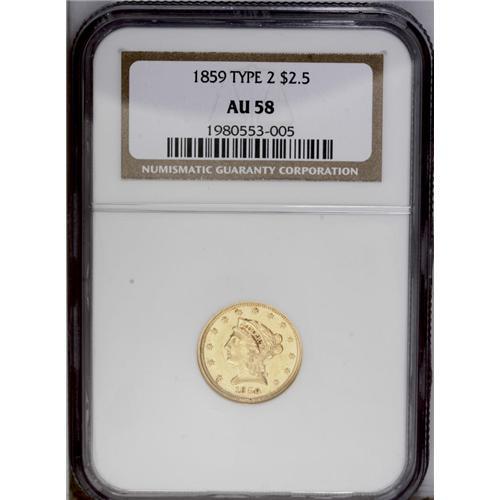 1859 $2 1/2 New Reverse, Type Two AU58 NGC. Sharply de 1859[$2 1/2] New Reverse, Type Two AU58 NGC.