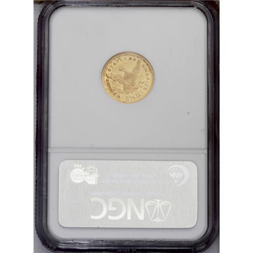 <B>1859<$2 1/2> New Reverse, Type Two AU58 NGC.</B></I> Sharply defined with attractive light yellow-gold color and minor stains or verdigris adhering to the surface. The New Reverse type, with long, slender arrowheads, is extremely elusive.