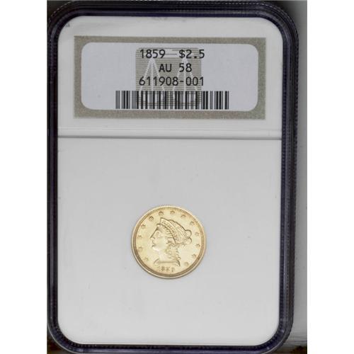 <B>1859<$2 1/2> New Reverse, Type Two AU58 NGC.</B></I> Traces of highpoint wear and some wispy field hairlines identify this piece as a mildly circulated example. Boldly struck save for the obverse stars, without severe marks on either side. Still somewhat lustrous, with pleasing light coloration. Census: 32 in 58, 38 finer (6/06).