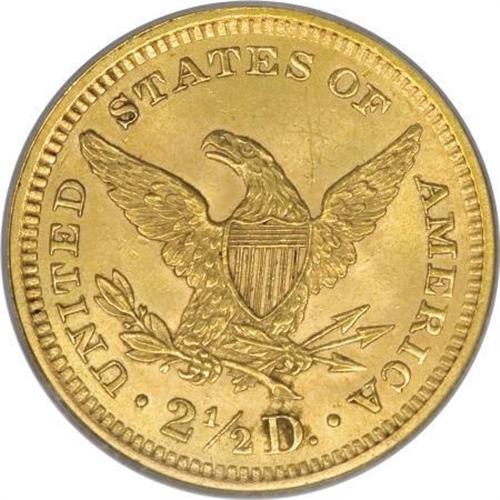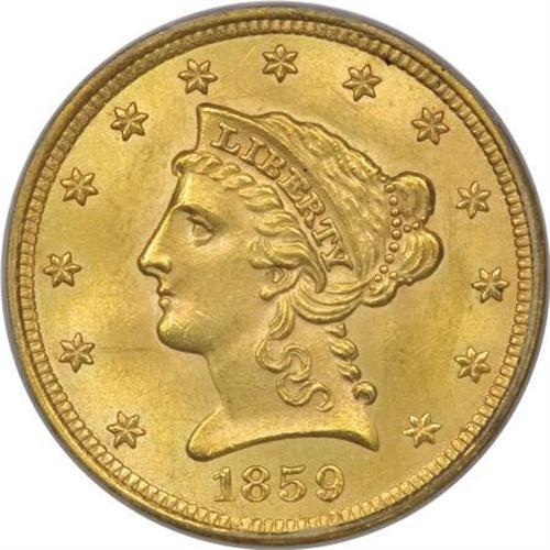 <B>1859 $2 1/2 New Reverse, Type Two MS63 PCGS.</B></I> The New Reverse coins introduced on the P-mint issues of this year show smaller letters and smaller arrowheads that are noticeably distant from CA. The issue is scarce in all Mint State grades, although it can occasionally still be cherrypicked at large shows. The present example offers lustrous and attractive orange-gold surfaces that are fully struck. Despite a couple of tiny luster grazes, a scrape on the reverse above the eagle, and a dark toning spot through the D of the denomination, none of those minor impairments dampen our enthusiasm for this lovely coin.<BR><BR><B>Coin Engraver:</B> Christian Gobrecht<BR><BR><b>Shipping:</b> Coins & Currency (<a target="_blank" href="http://www.heritageauctions.com/common/shipping.php">view shipping information</a>)