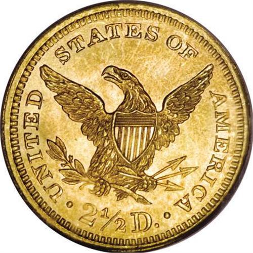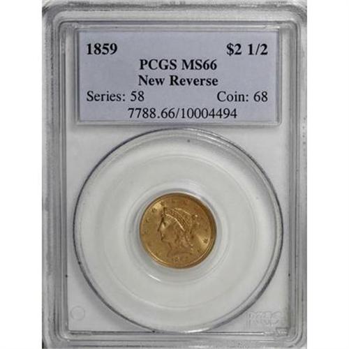 <B>1859 $2 1/2 New Reverse, Type Two MS66 PCGS.</B></I> The Type Two reverse with smaller arrowheads and letters was introduced in 1859, although quarter eagles were occasionally struck from the old-style hub (first used in 1840), from 1859 through 1861 (Jeff Garrett and Ron Guth, 2006). The 1859 is a low mintage issue with only 39,364 pieces produced, the lowest P-mint mintage from the 1850s. This is an astonishingly well preserved coin. The most dominant feature is the thick mint frost that covers each side. This frosted finish is also accented by a noticeable overlay of reddish patina, undoubtedly the source of the gold alloy having a higher copper content than silver. Sharply struck throughout. The only mentionable marks on either side are a couple of abrasions in the left obverse field. Population: 2 in 66, 0 finer (6/07).<BR><BR><B>Coin Engraver:</B> Christian Gobrecht<BR><BR><b>Shipping:</b> Coins & Currency (<a target="_blank" href="http://www.heritageauctions.com/common/shipping.php">view shipping information</a>)