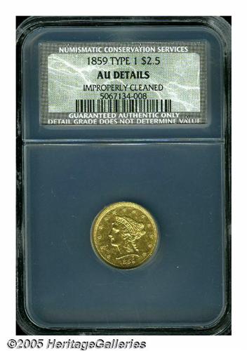 <B>1859<$2 1/2> Old Reverse, Type One AU Details, Improperly Cleaned, NCS.</B></I> Struck from the old 1840-58 reverse hub, which is characterized by longer arrows and arrowheads that almost touch the peripheral legend. Wispy hairlines are noted over each side. Yellow-gold surfaces display traces of luster in the protected areas, and a few shallow scrapes in the lower left (facing) obverse field. Well struck, except for weakness on the eagle's right leg.