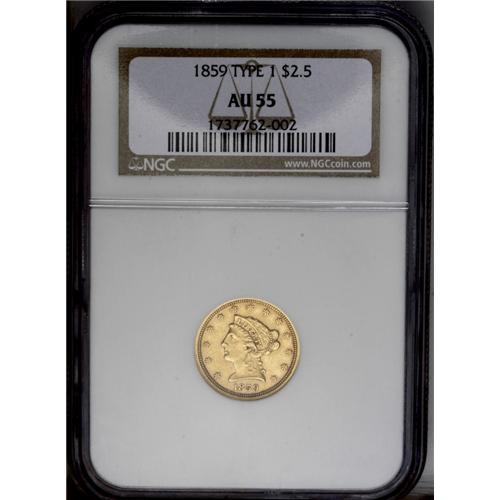 1859 $2 1/2 Old Reverse, Type One AU55 NGC. The broad