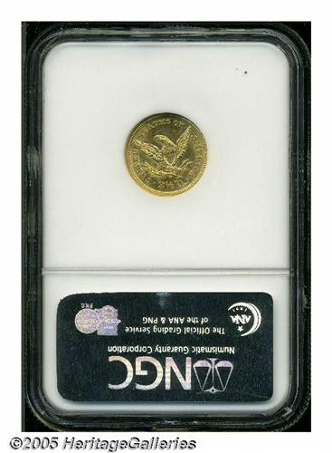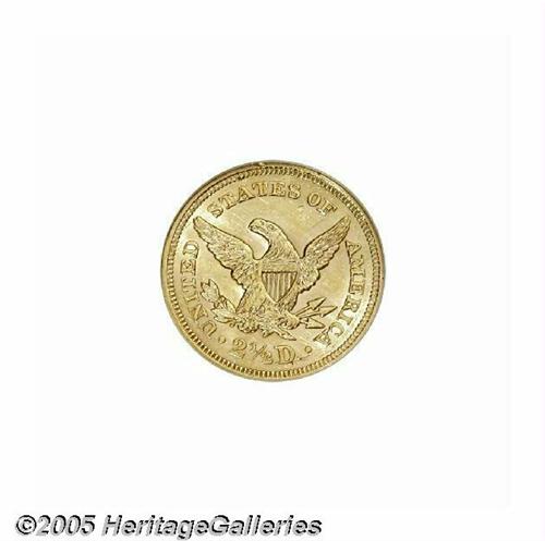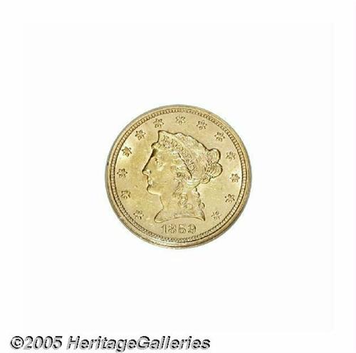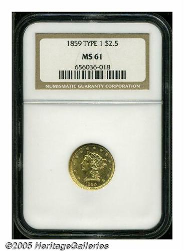 <B>1859<$2 1/2> Old Reverse, Type One MS61 NGC.</B></I> Both sides of this frosty and lustrous example are lightly abraded, and each side has a single noticeable mark. On the obverse, a rectangular scrape in the field is located between Liberty's forehead and star 5. The upper reverse field has a circular scrape below the O. The design detail on both sides is quite nicely defined. A lovely example that is seldom found in any Mint State grade. Population: 15 in 61, 12 finer (6/05).