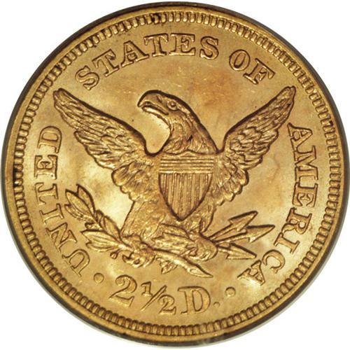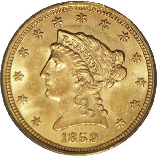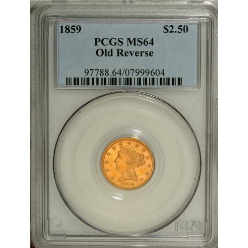 <B>1859 $2 1/2 Old Reverse, Type One MS64 PCGS.</B></I> Highly lustrous with strong central details beneath a coating of attractive reddish patina. The Old Reverse hub of the Liberty quarter eagle was introduced along with the type in 1840. This hub is identifiable by the close proximity of the lowest arrowhead to the CA in AMERICA and the closed talons on the eagle. Although replaced by a new reverse hub in 1859, the Old Reverse hub continued in use, albeit in a limited fashion, through 1861. Only a few dozen Mint State pieces survive of this long-overlooked variety and, at the MS64 level, it is among the finer examples known. Population: 3 in 64, 0 finer (12/06).<BR><BR><b>Shipping:</b> Coin/Currency (<a target="_blank" href="http://www.heritageauctions.com/common/shipping.php">view shipping information</a>)