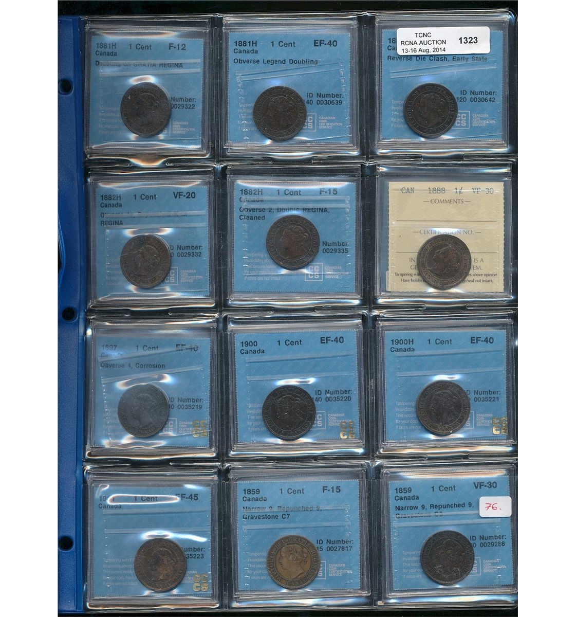 1859(2) N9 1¢, 1881H(3) 1¢, 1882H(2), 1888, 1897, 1900, 1900H & 1901. Lot of 12 pcs mostly CCCS graded F12 to EF. Also includes 1852, 1953, 1957(2), 1961, 1962(2), 1967(3), 1969 & 1977 Cents CCCS MS63 to MS64 with exception of 1952 VF20 designated with Die Clash. All dates 1952 plus come with various varieties, Hanging 7'S Dbl dates and more.