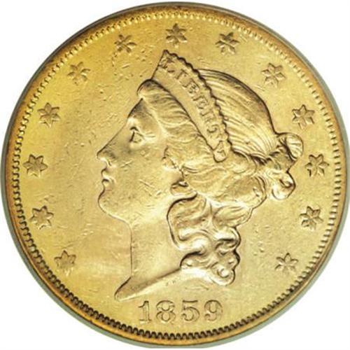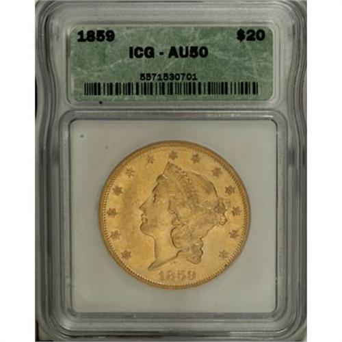 <B>1859 $20 AU50 ICG.</B></I> Jeff Garrett and Ron Guth (2006) state that the 1859 double eagle, with a business strike mintage of 43,597 pieces, is scarce in any grade, primarily because circulation strikes were largely ignored by early collectors who preferred proof examples of Philadelphia coinage. Most known examples are in the VF to XF grade range. Rich apricot-gold color with light green tinges adorns the lightly abraded surfaces of this AU50 example. Traces of luster cling to the design features, most of which are sharply defined.<BR><BR><B>Coin Engraver:</B> James B. Longacre<BR><BR><b>Shipping:</b> Coins & Currency (<a target="_blank" href="http://www.heritageauctions.com/common/shipping.php">view shipping information</a>)