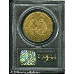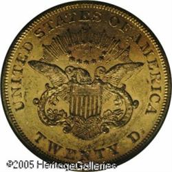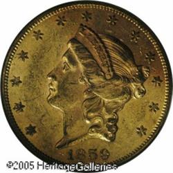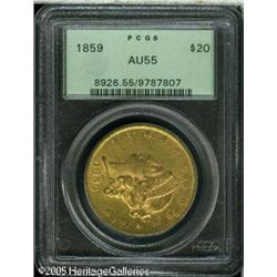 <B>1859 $20 AU55 PCGS.</B></I> A scarcer date in high circulated grades, and this one sports a good strike and decent surfaces for the grade. Moderate handling marks are found with a glass, but this one is appealing to the unaided eye. Housed in an older green insert PCGS holder. Population: 15 in 55, 12 finer (1/05). Lot:8983