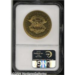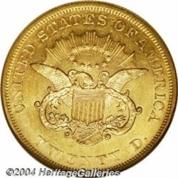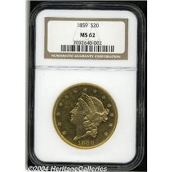 <B>1859<$20> MS62 NGC.</B></I> The 1859 is the fourth rarest Type One double eagle struck in the Philadelphia Mint. Of the 200-225 pieces known in all grades, only 4-6 coins are believed extant in mint condition. The 1859 also has the second lowest mintage figure of all Type One P-mint twenties with only 43,597 pieces produced. As with all known high grade (AU and better) 1859 twenties, the stars on the left side of the obverse are weakly struck. However, the design elements are well impressed elsewhere. With the possible exception of the 1866-S No Motto, the 1859 is the most difficult No Motto twenty to locate with choice surfaces, and almost all known examples are extensively abraded. This coin does show several more obvious marks on the left side of the obverse, but the remainder of the coin is remarkably clean for the issue. This is most likely the finest example known of this rarity with none finer at either of the major services and none equal in grade (3/04). <BR><BR><B>Important notice:</B> Heritage usually auctions material at the rate of 200-250 lots per hour. On some occasions eBay Live bid software or the Internet may not be able to keep up with the pace of the auction. We recommend placing a realistic absentee bid now as insurance to avoid disappointment. Occasionally the auctioneer may eliminate or reject an eBay Live bid, and the auctioneer may also reopen a lot after the close of the eBay live bidding (usually because we missed an audience bid), and may reject your bid even if it shows you as the winning bidder. By bidding via eBay Live, you agree that Heritage may award the lot to another bidder at its sole discretion under the circumstances described above or any other reasonable circumstances. Since eBay bids are not shown to us until we open the lot on the floor, we treat those bids just like floor bids. In most cases the floor responds before the eBay bid is presented to us, due to Internet lag time, so for consistency we have made it a policy that floor bids are always considered first over tie eBay live bids. Also please note that all Heritage lots purchased through eBay Live carry a 20% Buyer's Premium. Please make sure you read the Terms and Conditions before you bid. </span></font></tr></table></td></tr></table>