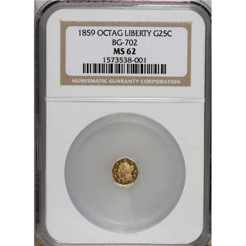 <B>1859 25C Liberty Octagonal 25 Cents, BG-702, R.3, MS62 NGC.</B></I> NGC Census: (0/12). PCGS Population (24/0). (#10529)<BR><BR><b>Shipping:</b> Coins & Currency (<a target="_blank" href="http://www.heritageauctions.com/common/shipping.php">view shipping information</a>)
