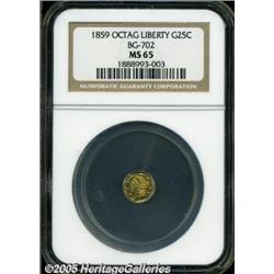 <B>1859 25C Liberty Octagonal 25 Cents, BG-702, R.3, MS65 NGC.</B></I> Golden-brown in color with hints of olive hue across the reverse. A somewhat matte-like representative of this Period Two issue. Die rust (as made) is near the bust tip and is west of the 4 in the fraction.
