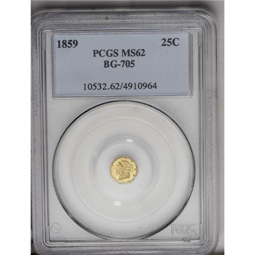 <B>1859<25C> Liberty Octagonal 25 Cents, BG-705, High R.6, MS62 PCGS.</B></I> A rare variety that has a heavy die clash of the reverse wreath into the lower obverse. The centers are softly struck, but the surfaces are well preserved and certainly attractive from a technical perspective. Population: 8 in 62, 1 finer (4/06).