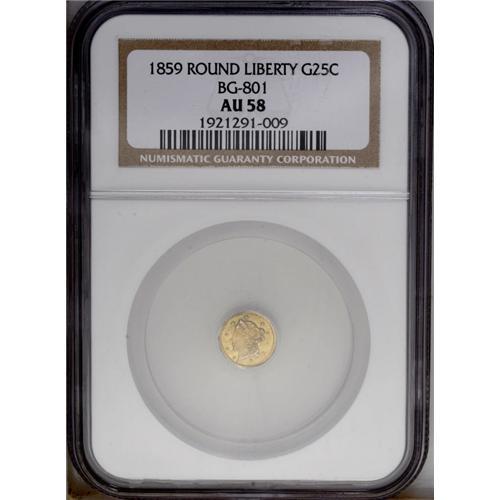 1859 25C Liberty Round 25 Cents, BG-801, R.3, AU58 NGC