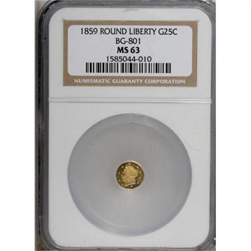 <B>1859 25C Liberty Round 25 Cents, BG-801, R.3, MS63 NGC.</B></I> NGC Census: (7/11). PCGS Population (33/49). (#10662)<BR><BR><b>Shipping:</b> Coins & Currency (<a target="_blank" href="http://www.heritageauctions.com/common/shipping.php">view shipping information</a>)