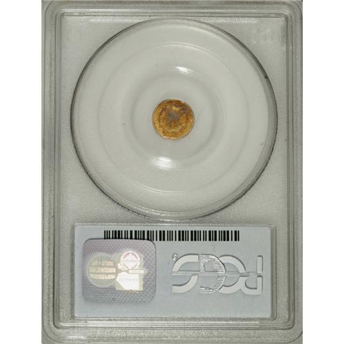 <B>1859 25C Liberty Round 25 Cents, BG-801, R.3, MS65 PCGS.</B></I> The crude BG-801 is the sole 1859 round quarter dollar variety. This primarily peach-red Gem has a couple of areas of cobalt-blue and rose-red on the reverse. Population: 14 in 65, 0 finer (3/07).<BR><I>From The Diamond K Collection of California Fractional Gold.</B></I><BR><BR><b>Shipping:</b> Coins & Currency (<a target="_blank" href="http://www.heritageauctions.com/common/shipping.php">view shipping information</a>)