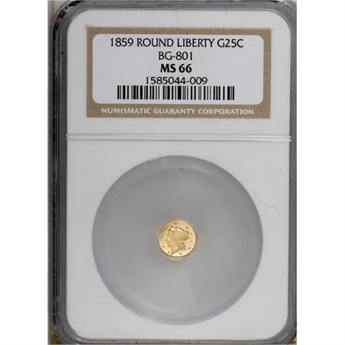 <B>1859 25C Liberty Round 25 Cents, BG-801, R.3, MS66 NGC.</B></I> NGC Census: (4/0). PCGS Population (0/0). (#10662)<BR><BR><b>Shipping:</b> Coins & Currency (<a target="_blank" href="http://www.heritageauctions.com/common/shipping.php">view shipping information</a>)