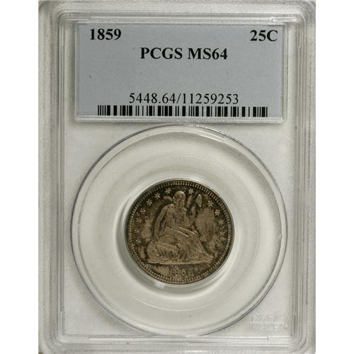 <B>1859 25C MS64 PCGS.</B></I> Glowing luster radiates from well cared-for surfaces that are bathed in silver-gray, beige-orange, and aqua-blue patination. A sharp strike has resulted in excellent motif definition. Population: 18 in 64, 11 finer (1/07).<BR><BR><b>Shipping:</b> Coins & Currency (<a target="_blank" href="http://www.heritageauctions.com/common/shipping.php">view shipping information</a>)