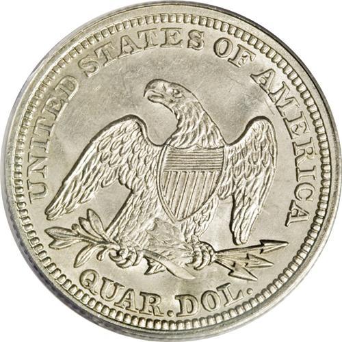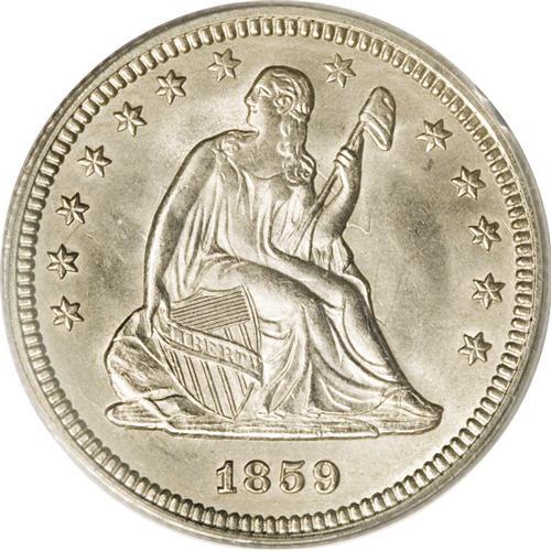 <B>1859 25C MS64 PCGS.</B></I> The surfaces of this pleasing piece show a bright satiny luster and the paucity of distracting marks that would be expected of the grade. A bit softly struck on the highest points of the reverse.<BR><BR><b>Shipping:</b> Coins & Currency (<a target="_blank" href="http://www.heritageauctions.com/common/shipping.php">view shipping information</a>)