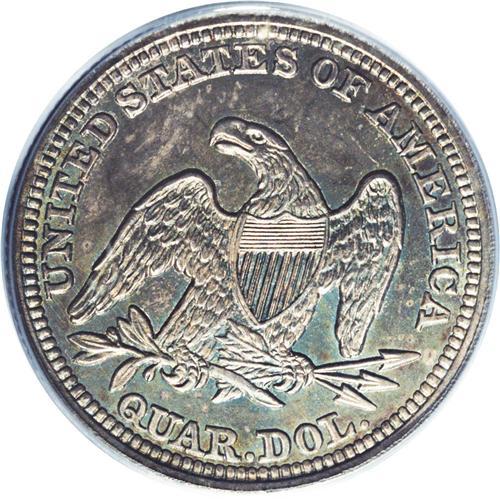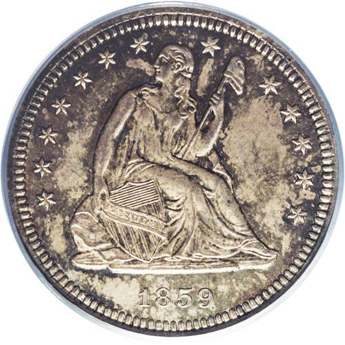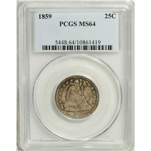 <B>1859 25C MS64 PCGS.</B></I> Type One Obverse and Reverse. Richly toned tan and sea-green. This boldly struck representative has nearly mark-free fields, and the gently shimmering surfaces are void of distractions. After years of large mintages compelled by a reduction of silver content, the 1859 had a lesser emission of 1,343,000 pieces. Population: 17 in 64, 11 finer (10/06).<BR><BR><b>Shipping:</b> Coin/Currency (<a target="_blank" href="http://www.heritageauctions.com/common/shipping.php">view shipping information</a>)
