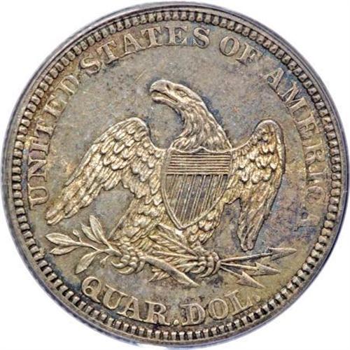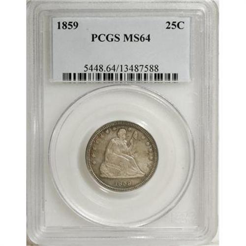 <B>1859 25C MS64 PCGS.</B></I> One of the more frequently located dates in the No Motto series but only occasionally located in MS64 or better condition. Both of the major grading services have certified a total of 38 pieces (minus an uncertain number of resubmissions) in MS64, and only 18 pieces have been graded finer (10/07). This is a well struck piece whose only noticeable area of softness is on the right peripheral stars on the obverse. Toned in deep, variegated shades with bright underlying mint luster.<BR><BR><B>Coin Engraver:</B> Christian Gobrecht<BR><BR><b>Shipping:</b> Coins & Currency (<a target="_blank" href="http://www.heritageauctions.com/common/shipping.php">view shipping information</a>)