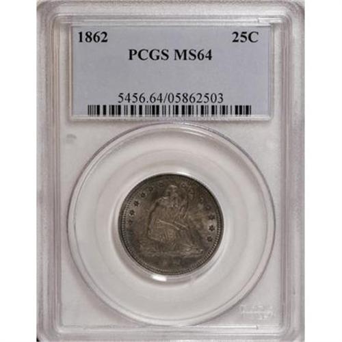 <B>1859 25C MS64 PCGS.</B></I> Type One Obverse and Reverse. This highly lustrous piece has satiny silver surfaces with considerable reddish-gold, lilac, and blue toning on both sides. Well over 1 million examples of this No Motto issue were coined, yet few can equal or exceed the quality of this piece. Population: 21 in 64, 11 finer (1/08).<BR><BR><B>Coin Engraver:</B> Christian Gobrecht<BR><BR><b>Shipping:</b> Coins & Currency (<a target="_blank" href="http://www.heritageauctions.com/common/shipping.php">view shipping information</a>)
