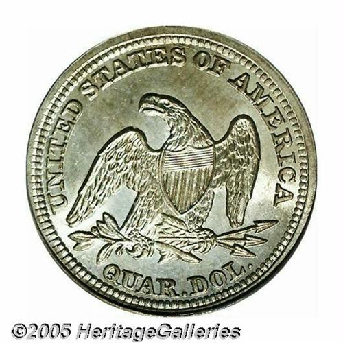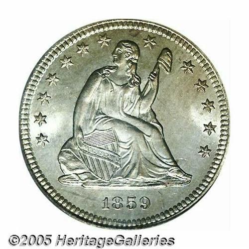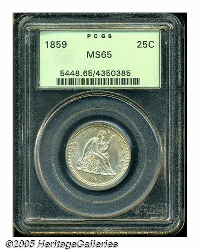 <B>1859<25C> MS65 PCGS.</B></I> Seated Quarter production at the Philadelphia Mint fell from 7.3 million pieces in 1858 to 1.3 million coins in 1859. Survivors of the latter issue are somewhat scarce in all grades, and Gems are of the utmost rarity. This originally preserved specimen is lightly toned in mottled russet-tan shades. Some light die clashing shows on each side. Boldly struck in most areas, and easily within the Condition Census for the issue. Population: 5 in 65, 4 finer (4/05).