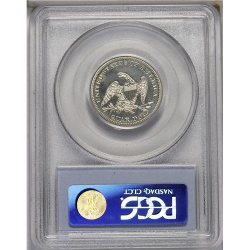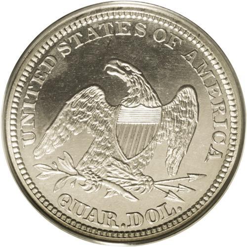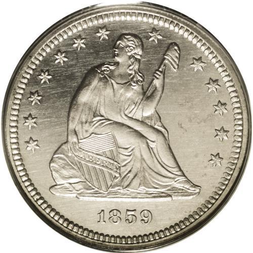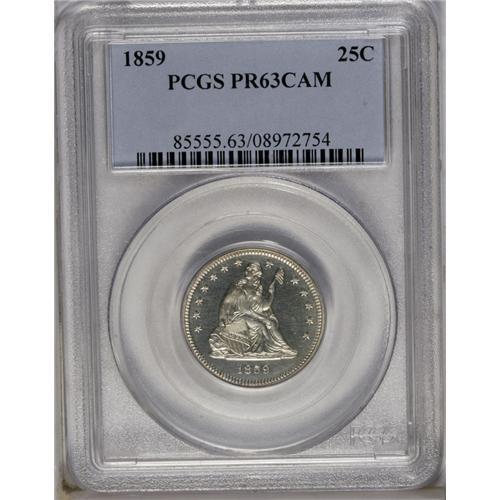 <B>1859<25C> PR63 Cameo PCGS.</B></I> Although Mint records indicate that 800 proofs were struck in this year, an unknown number were melted at year's end as unsold, leaving this issue with a relatively high official mintage but low availability in all grades. This example exhibits a fully brilliant appearance over proof surfaces that is lightly accented with a cameo appearance. The design features are exquisitely struck throughout. An area of planchet roughness under the ED of UNITED is noted for accuracy.