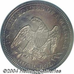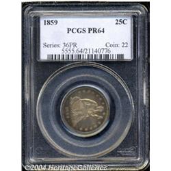 <B>1859<25C> PR64 PCGS.</B></I> Although Mint records indicate that 800 proofs were struck in this year, an unknown number were melted at year's end as unsold, leaving this issue with a relatively high official mintage but low availability in all grades. This example portrays lovely medium-intensity golden-brown toning over proof surfaces, framed by a narrow ring of deep gunmetal-blue and crimson coloration around the rims. The design features are exquisitely struck throughout. A couple of trivial marks on the obverse motif are noted for accuracy. Population: 40 in 64, 16 finer (3/04).<BR><I>From the JFS Collection.</B></I> <BR><BR><B>Important notice:</B> Heritage usually auctions material at the rate of 200-250 lots per hour. On some occasions eBay Live bid software or the Internet may not be able to keep up with the pace of the auction. We recommend placing a realistic absentee bid now as insurance to avoid disappointment. Occasionally the auctioneer may eliminate or reject an eBay Live bid, and the auctioneer may also reopen a lot after the close of the eBay live bidding (usually because we missed an audience bid), and may reject your bid even if it shows you as the winning bidder. By bidding via eBay Live, you agree that Heritage may award the lot to another bidder at its sole discretion under the circumstances described above or any other reasonable circumstances. Since eBay bids are not shown to us until we open the lot on the floor, we treat those bids just like floor bids. In most cases the floor responds before the eBay bid is presented to us, due to Internet lag time, so for consistency we have made it a policy that floor bids are always considered first over tie eBay live bids. Also please note that all Heritage lots purchased through eBay Live carry a 20% Buyer's Premium. Please make sure you read the Terms and Conditions before you bid. </span></font></tr></table></td></tr></table>