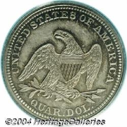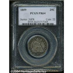 <B>1859<25C> PR64 PCGS.</B></I> Breen-4018. Type I obverse and reverse which Breen described as very rare. This is a naturally toned Choice Proof with excellent eye appeal. Medium gray color is accented by iridescent toning, all over reflective fields. The devices show slight luster, but not enough to call this a Cameo Proof. <BR><BR><B>Important notice:</B> Heritage usually auctions material at the rate of 200-250 lots per hour. On some occasions eBay Live bid software or the Internet may not be able to keep up with the pace of the auction. We recommend placing a realistic absentee bid now as insurance to avoid disappointment. Occasionally the auctioneer may eliminate or reject an eBay Live bid, and the auctioneer may also reopen a lot after the close of the eBay live bidding (usually because we missed an audience bid), and may reject your bid even if it shows you as the winning bidder. By bidding via eBay Live, you agree that Heritage may award the lot to another bidder at its sole discretion under the circumstances described above or any other reasonable circumstances. Since eBay bids are not shown to us until we open the lot on the floor, we treat those bids just like floor bids. In most cases the floor responds before the eBay bid is presented to us, due to Internet lag time, so for consistency we have made it a policy that floor bids are always considered first over tie eBay live bids. Also please note that all Heritage lots purchased through eBay Live carry a 20% Buyer's Premium. Please make sure you read the Terms and Conditions before you bid.