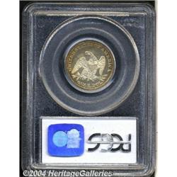 <B>1859<25C> PR65 Cameo PCGS.</B></I> The frosty devices offer a nice contrast with moderately reflective fields. A thin veil of golden-brown color occupies the fields of both sides, further enhancing the cameo effect with the mostly silver-gray main devices. A splash of deep aqua blue and lavender in the upper obverse rim area adds to the beauty of this exquisitely struck Liberty Seated quarter. A few insignificant wispy hairlines, particularly in the obverse fields, are mentioned for accuracy. Population: 2 in 65, 3 finer (3/04). <BR><BR><B>Important notice:</B> Heritage usually auctions material at the rate of 200-250 lots per hour. On some occasions eBay Live bid software or the Internet may not be able to keep up with the pace of the auction. We recommend placing a realistic absentee bid now as insurance to avoid disappointment. Occasionally the auctioneer may eliminate or reject an eBay Live bid, and the auctioneer may also reopen a lot after the close of the eBay live bidding (usually because we missed an audience bid), and may reject your bid even if it shows you as the winning bidder. By bidding via eBay Live, you agree that Heritage may award the lot to another bidder at its sole discretion under the circumstances described above or any other reasonable circumstances. Since eBay bids are not shown to us until we open the lot on the floor, we treat those bids just like floor bids. In most cases the floor responds before the eBay bid is presented to us, due to Internet lag time, so for consistency we have made it a policy that floor bids are always considered first over tie eBay live bids. Also please note that all Heritage lots purchased through eBay Live carry a 20% Buyer's Premium. Please make sure you read the Terms and Conditions before you bid.