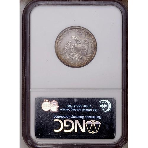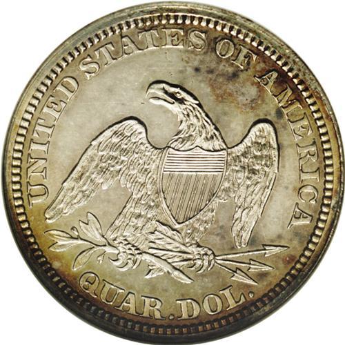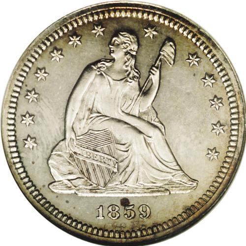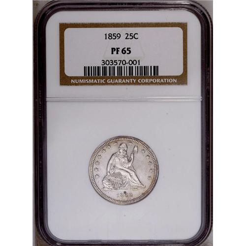 <B>1859<25C> PR65 NGC.</B></I> Federal records indicate that 800 proof Seated quarters were delivered in 1859, but we doubt whether all of these coins were distributed before the end of the year. Those that were not were melted, and this issue is a well known rarity in all grades. Lightly toned in peripheral copper-red shades, both sides of this coin are pleasingly reflective. The strike is full, and the surfaces are nearly hairline-free. Census: 17 in 65, 15 finer (2/06).