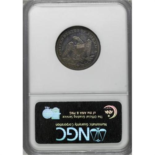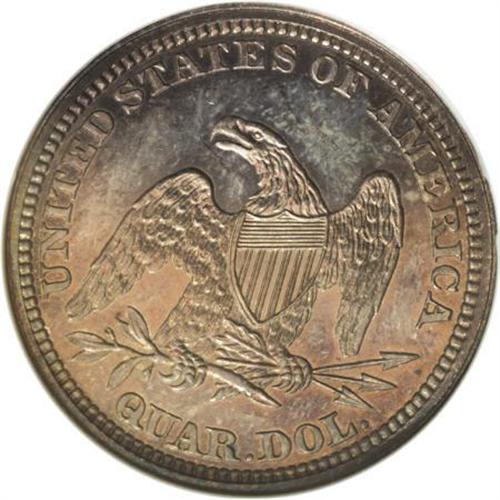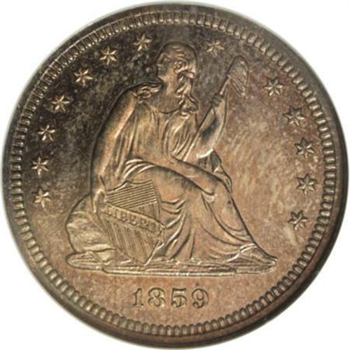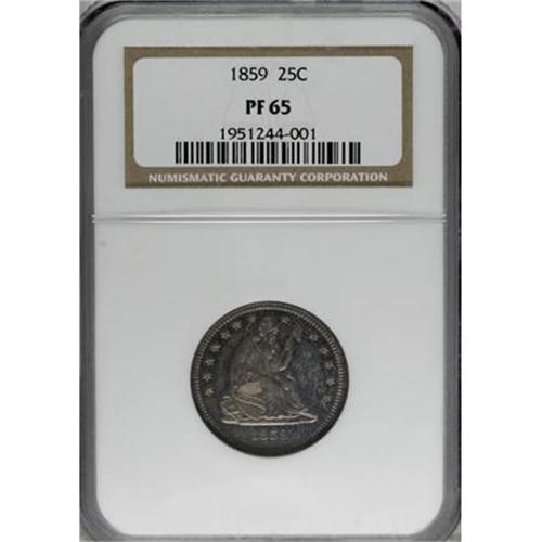 <B>1859 25C PR65 NGC.</B></I> This luscious Gem Seated quarter, one of 800 minted, boasts iridescent blue, amber, and gold toning on the well-struck surfaces. A few light hairlines are noted in the reverse field above the eagle. The left line of the fourth stripe travels upward to the second horizontal shield stripe. Census: 16 in 65, 15 finer (7/07).<BR><BR><B>Coin Engraver:</B> Christian Gobrecht<BR><BR><b>Shipping:</b> Coins & Currency (<a target="_blank" href="http://www.heritageauctions.com/common/shipping.php">view shipping information</a>\)